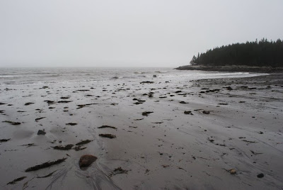 When you live on the Coast of Maine, you learn to accept the weather for better or for worse. Fog, rain, wind and snow, can all appear in an instant, changing the environment around you into a whole different animal. I have seen fogs in the summer so thick that I could not see the ground from my upstairs window. Last summer, we had a two week stretch where 12 inches of rain fell in the middle of June. I have heard the wind literally whistle past my bedroom window on numerous occasions, and I have seen 26 inches of snow fall in a 24 hour period. Each season can bring it's own particular weather, but as the winter months begin to unfold, the weather intensifies, and your acceptance of it is therefore stretched to certain limits. This past week on the coast has seen 8 inches of snow, 3 inches of rain and a period of heavy, gusty, and damaging wind. What a strange week of weather it was! Right after a fresh coating of snow settled over Camden, a coastal storm brought a steady rain that wiped away any glimpse of white on the ground. The incessant rain was then followed by a blustery Sunday night, when the wind howled and gusted upwards of 60 mph. Trees were knocked down, limbs were scattered across roads, and the Penobsoct Bay rose to 8 feet, its raging waters forming whitecaps in the distance. Monday morning brought an end to the storm, and a foggy morning allowed for a close inspection of what the storm had left behind. Lucia Beach, on the eastern side of St. George Peninsula, sits about 3 miles south of Owls Head and the western entrance to Penobscot Bay. Long a favored retreat for local residents, the beach has a certain remoteness to it, which is further enhanced by its location at the end of a dirt road, which can only be accessed by a back road in South Thomaston. The beach itself is no more than a mile wide, with two rocky headlands guarding the western and eastern boundaries. On the western side of the beach a brilliant forest of spruce and moss can be explored, while the eastern side features giant boulders and rocks where waves crash and surf sprays. The beach itself offers a great view out into the Muscle Ridge Channel and up to the backside of Vinalhaven Island. I was alone this morning, not a soul in sight, as I combed the beach in search of sea glass and washed up debris from the storm. I found all kinds of colored and textured rocks, beach wood that has been blown into shore, and at least two abandoned lobster traps. As I wandered the beach, the fog began to roll in pretty heavy, blanketing the tall pines in a ghostly swirl of mist. The Spruce forest was soaked from the weekend's rain, and the smell of the trees was intoxicating. The moss on the ground was dripping with life and the crash of the ocean's waves could be heard in the distance. I love the feeling of being surrounded by spruce trees, where you can peek through the branches and see the ocean. There is a forest like this on Deer Isle, down in Crockett's Cove, and out on Schoodic Point in Winter Harbor. There is just something about the combination of the ocean and spruce that brings a feeling of calm over me and brings me back to my basic love of nature and her many offerings. As a child, I would roam the spruce filled woods of Mosquito Head in Martinsville, down the road from our summer house. I remember that feeling of being in total isolation with the ocean and with the trees. There was something so natural about it, something so pure. The fog was now what you call "pea soup," thick and I headed back to the beach entrance, picking up sea shells as I walked. Before leaving, I turned towards the ocean and took a deep breath. The towering pines were barely visible and the crash of the waves was now merely a sound in the mist that came and went every ten seconds. Seagulls flew overhead and the foghorn on Owls Head light moaned in the distance. The storm has passed. It was a Maine day indeed!Thursday, December 9, 2010